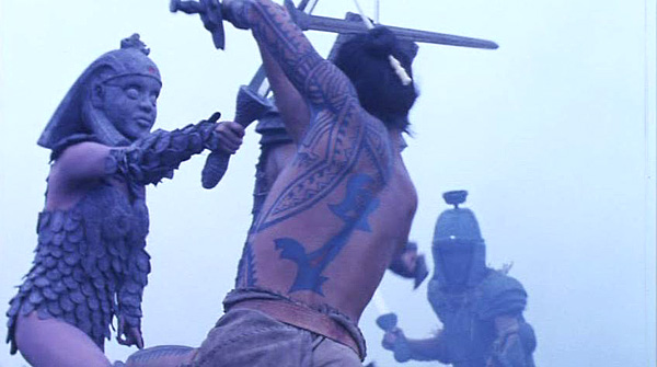 So yeah, Zipang has enough wacked-out shit to keep you guessing throughout what is (inevitably) too long a movie. It gets mired down in the third reel with a lot of conversations and emotional conflicts. However up to then there’s enough cool ninja stuff, beautifully filmed fights and Yuri the Pistol cuteness to carry me, and then some. The stone age Japanese warriors are a rare treat, and the make-up effects and costuming are just great.