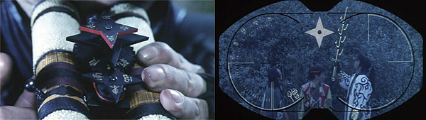 The ratchet-and-wire-sprung claw thing above is a replacement for a hand lost in combat. It can launch off his arm like a Shogun Warrior’s missile hand, with grappling line and everything. Even more absurd (read: awesome) is a binocular/camera rig which codes color photos onto shuriken-shaped discs, which are then thrown into the wind where they home in to HQ. Note the ray skin on the housing, like a katana handle. Nice detail… on an absolutely ridiculous prop!
