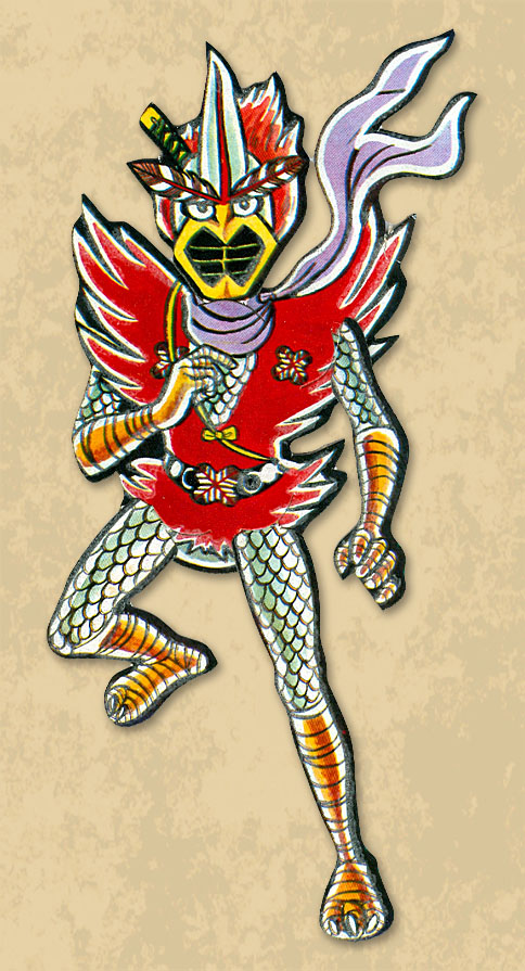 When punched-out and assembled, these 8″ cards produce nifty 6.5″ semi-articulated paper dolls. Looks like the transforming bird-themed super ninja has been portrayed by a third party artist working for the licensors, the art sits somewhere between the manga and television versions of the character design.