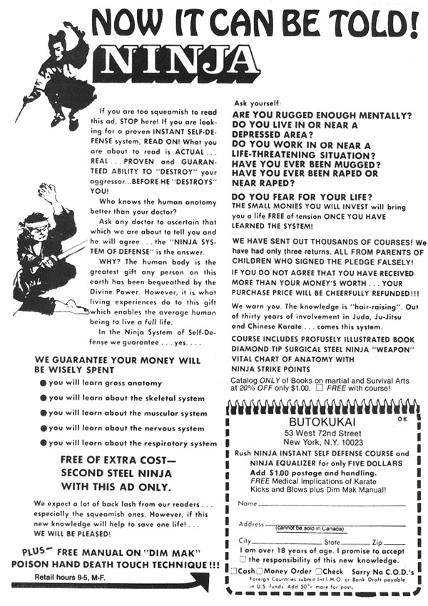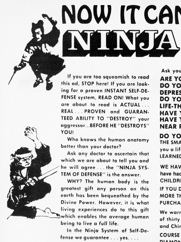 This same copy suggesting major revelations of ninjutsu is nearly identical to karate and kung-fu ads from the decade previous. Yet another example of companies taking their stale martial arts offerings and ‘retro-shinobi-fying’ them in the 80s.