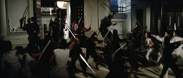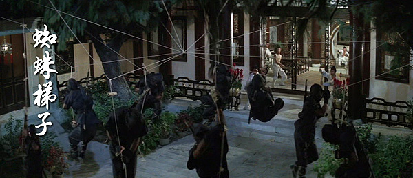 Gold, brown, blue, red and beige schemes aside, FEN also has a damn nifty commando raid where a platoon of black-clad ninja adeptly bypass the kung-fu compound’s ample defenses and lay waste to the remaining students. It is probably the best tactical ninja action in any Hong Kong / Chinese movie.
