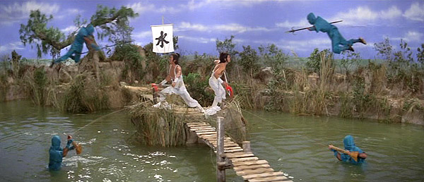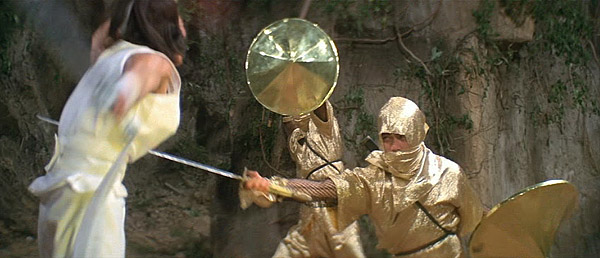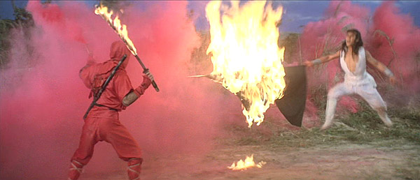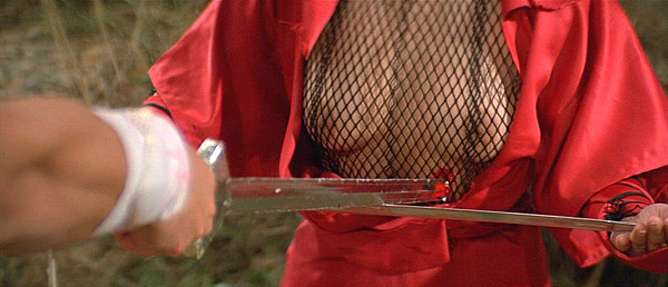 Pretty amazing what you miss in inferior transfers. Besides the glory of the wideness, correct colors (important in a gimmick movie like this!), and a razor sharp print, there’s also a LOT more gore, and some additional flesh, including this often cut, completely inexplicable scene where one of the clearly male fire ninja reveals himself to be a chick to distract an opponent. Another WTF moment in the one of the most WTF-worthy films in martial arts cinema history.