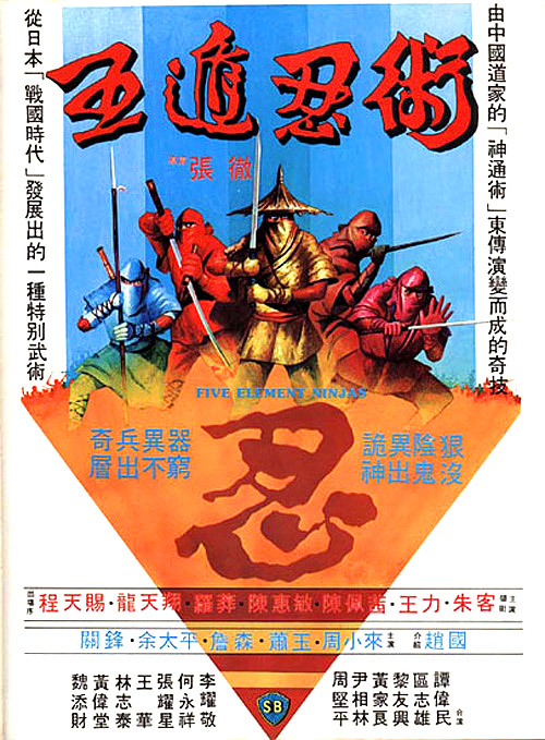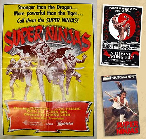 The English-language market poster wasn't a whole lot better, although I do love that illo. FEN was certainly named after the earlier film FIVE ELEMENT KUNG-FU. Note one of the earliest VHS releases, all kung-fu, no ninja. Baffling, especially for an 80's release.