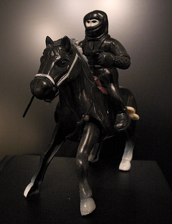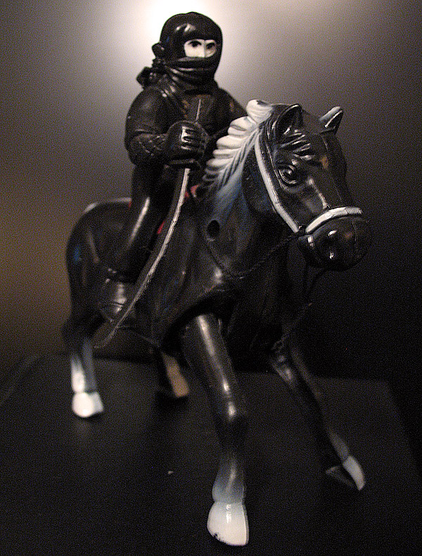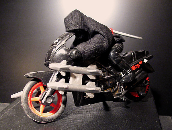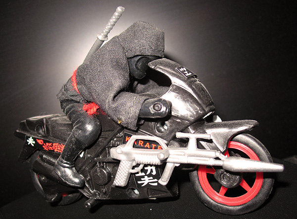 I bought these both in the 80's and last month! The 5" friction-powered bike clearly has a conventional helmeted racer that has been 'shinobi-fied' with a quick hooded cloth tunic and sword.