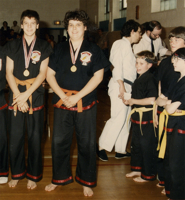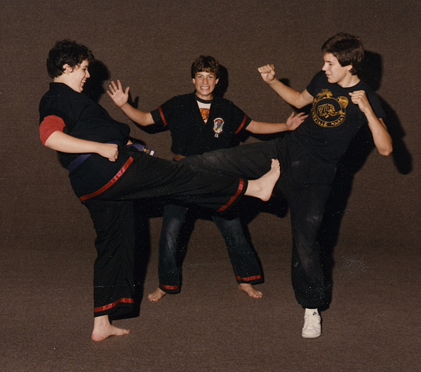 Tim in his dojo jacket, which we both sported for a while, rebuffing our high school’s colors. I got in hot water with our sifu once when my jacket smelled of perfume. I had lent it to a shivering upper-classmen hottie with huge freckled boobs earlier that day in class. Fealty to the dojo’s code was one thing, but to a teenager, huge freckled cleavage bred a whole different level of dedication.