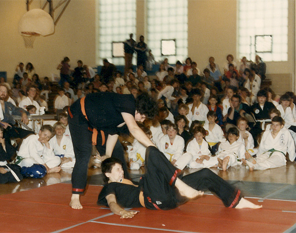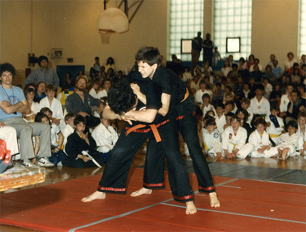 In April of 85 we entered a tournament and did this totally kick-ass fighting demo. Here, Tim is unwise enough to throw a full-nelson on me, which was NOT going to work for two reasons: 1) you can’t hold a big lard ass in a full-nelson, and 2) you don’t put a grappling move on a total pro wrestling mark, ‘cuz if you do…