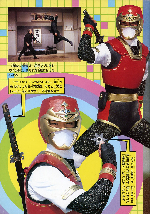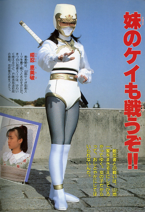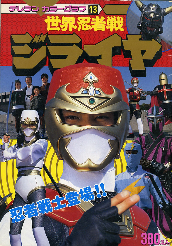 A noble ninja family battles an ancient demon and his evil hordes, with international ninja from around the globe thrown into the mix. Gimmicked vehicles, soaring stunt work and plenty of explosions in rock quarries are on tap. It’s World-Wide Ninja War Jiraiya, as seen in a 1988 photo book: