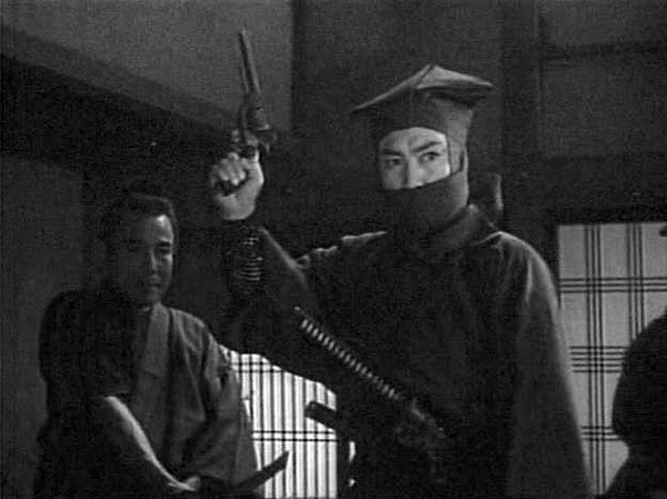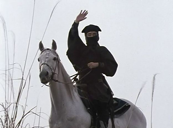 The film ends with a memorable showdown on a narrow road, as a stalwart Black Hood – modern pistols drawn – marches toward a Shinsegumi force armed with obsolete Japanese muskets.