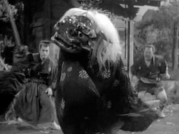 The absolute highlight of this film is an incognito Kurozukin donning a parade dog (lion? dragon?) to fend off a gang of thugs. They are spooked and stymied by this outré offense, as he bites their blades and head-butts them into submission.