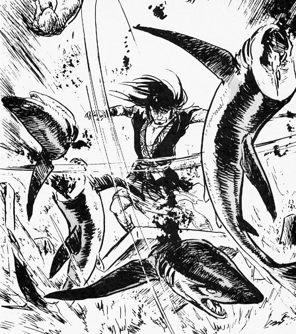 The “Island of Sugaru” storyline had all sorts of elements that made it largely un-filmable in the analog era. Kamui’s repertoire of completely over-the-top signature martial arts bordered on superpowered pro-wrestling. The best of Hong Kong’s wire crews wouldn’t have tried these gravity-defying grappling spots on a bet, and the Japanese industry never had the same level of stunt skills. Then there’s the major sub-plot involving a band of shark hunting pirates who slice the sea-breaching predators to pieces in mid-air. Feeding frenzies and human carnage galore. No way that’s happening with practical effects.