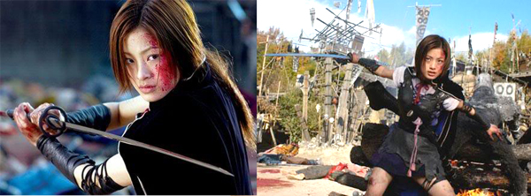 2003: AZUMI – digital as a last resort in an otherwise superb practical-effects showcase. CG (good for the most part, with a few awful exceptions) was used to enhance the fight scenes, remove wires and harnesses and composite the pop-star lead into exploding set pieces unsafe for any stuntwoman. They rarely if ever animated fake humans and for the most part bad CG never yanks you out of a period-set film.