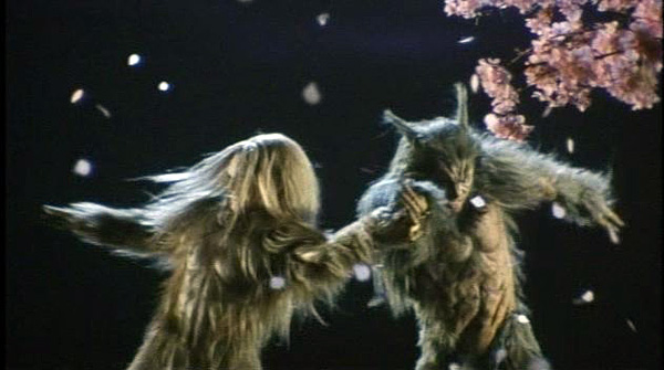 The furry duel was shot in-studio with a fake interior that really harkens back to classic Shaw Bros. While cherry blossoms fall, the two whirl around like hippy dervishes. The combat tries to approach the kaiju-judo awesomeness that is War of the Gargantuas, but it’s just not long enough, dammit!
