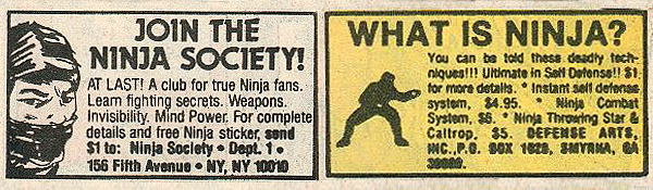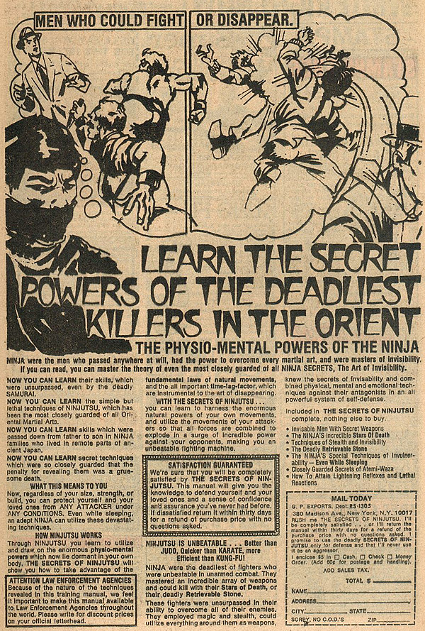 Want to chart the history of martial arts training (and exploitation media) in the U.S.? Just look at the ads that ran in comic books. They went from Judo to Karate to Kung-Fu to Ninja, decade by decade, always promising deadly secrets revealed and skills that would keep you from getting sand kicked in your face on the beach.