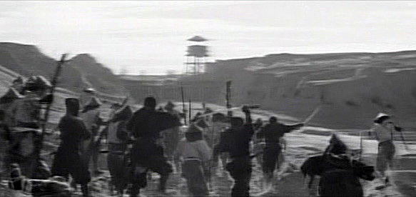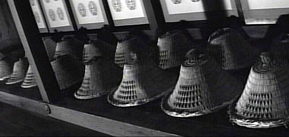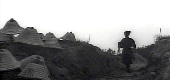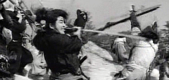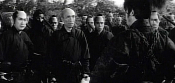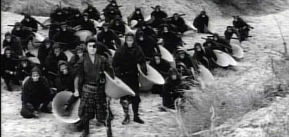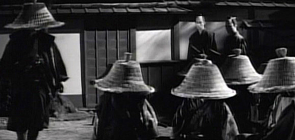 Director Shoji Matsumura took familiar characters and stories, but added a lot of ninja and some amazing B&W photography to give the material poignance in the 60's craze.Gorgeous photography here. Fights abound here, but one-on-one duels are set aside as......every viable shadow-skilled swordsman of the Yagyu clan is assembled for an impossible mission.The force's numbers are represented by the growing collection of 'gasa' travelling hats in the family chambers. These will continue to be an important symbol throughout the film.The basket hats are eventually shed for battle gear, and left behind by men who know full well they probably won't need them again.