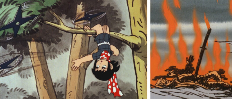 Then there’s the thoroughly Japanese trait of undulating between the utterly juvenile and the jaw-droppingly adult — its high-register kawaii slapstick one minute, then bloody massacres the next. [Trigger Warning for animal lovers!] At one point Sasuke’s living in a cave eating the meat from a mastodon frozen in a glacier, the next he’s contemplating the existential dread of being an orphan driven by revenge. All the while, grown-ass adults are trying to eliminate him, with extreme prejudice, and the body-count for this grade-school aged ninja boy just keeps growing…