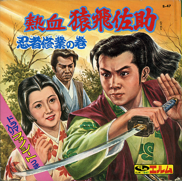 This kid’s book-and-record (flexi-disc that is) Sarutobi Sasuke: Ninja Shugyou (Ninja Training?) is from 1973, and I know little more than that. The art throughout its 10 cardboard pages is no great shakes – and is actually quite stiff at times – but there is one killer ninja combat spread, and a great back cover. Are they trying to portray Raizo Ichikawa there?