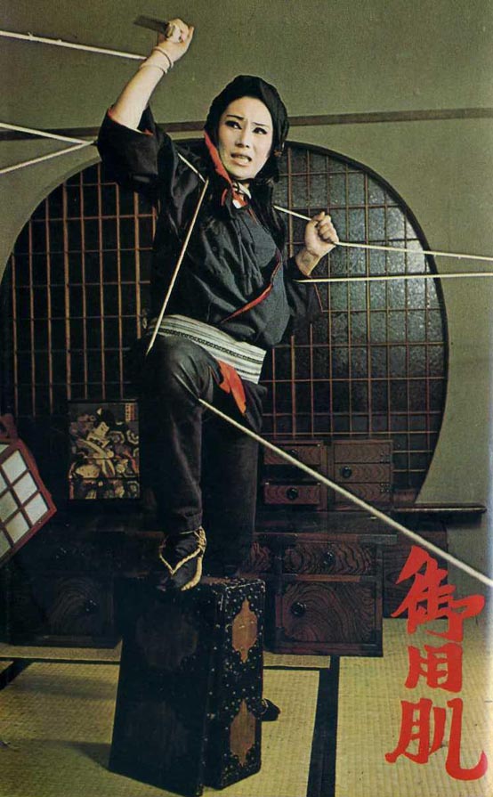 Sangre Yakuza is an excellent Spanish-language blog full of Japanese gang-war movie posters, topless sukebans, tattoo’d girls in bondage (like the above kunoichi-esque bandit about to get abused), and karate-kickin’ honeys.