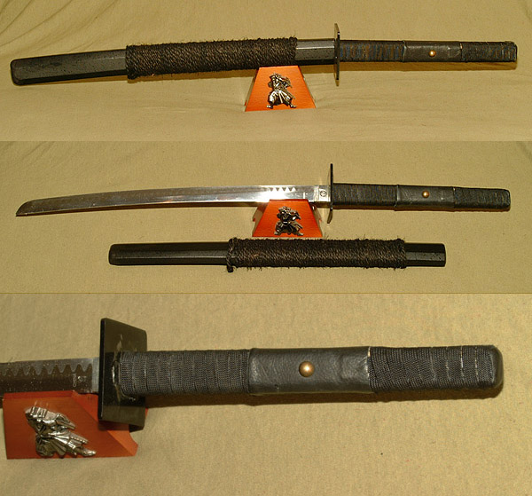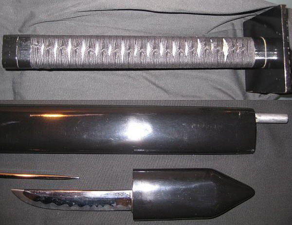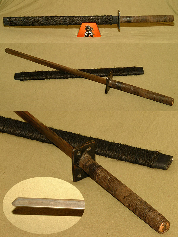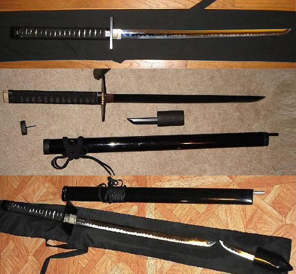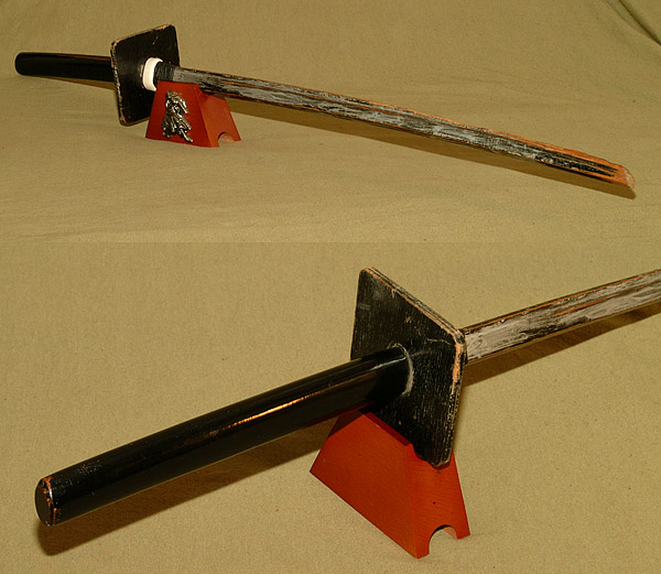 I’m no swordsmith or craftsman of any skill, but I dabble and experiment once in a while. This is a prop I made in 2004 for a photo shoot for the old Ninja80 site, deliberately fashioned to look like a 60s Japanese movie sword. Started out with a knock-off “practical full-tang” wakizashi from either BudK or a shop in Chinatown, elongated the handle, slapped some leftover cord and leather remnants on there one night, and got what stage prop guys call “good from afar, far from good” results. Looked OK – and definitley not off-the-rack – in the pics though, and that’s what counted.
