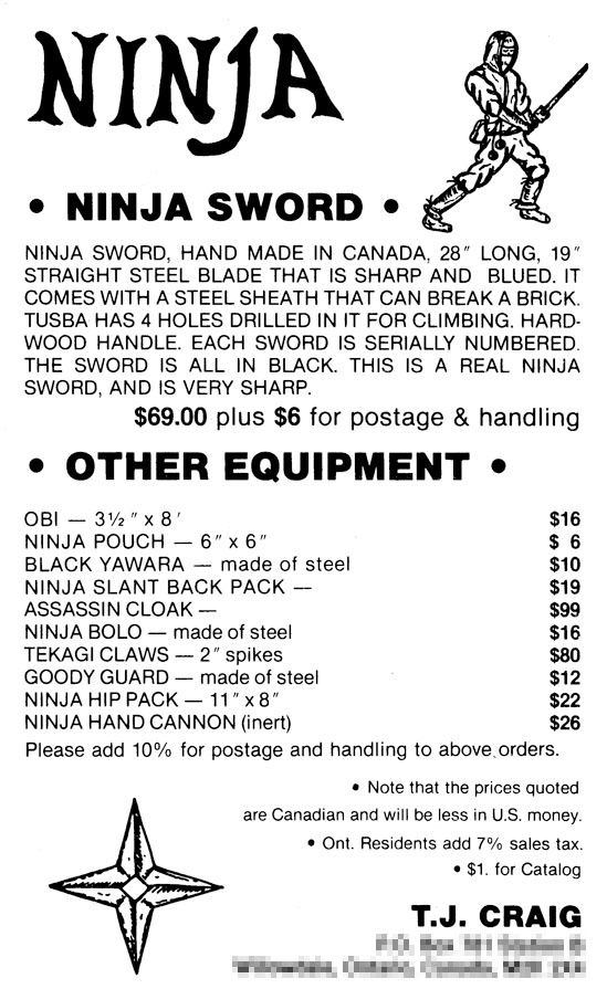 Another treasure didn’t fare as well in storage, but then it wasn’t that pretty to start with… a T.J. Craig ‘Real’ Ninja Sword. Tim and I sent a summer’s worth of saved and scrounged nickels and dimes to some obscure address in Canada for these after seeing the no-frills ad in Ninja or Black Belt.