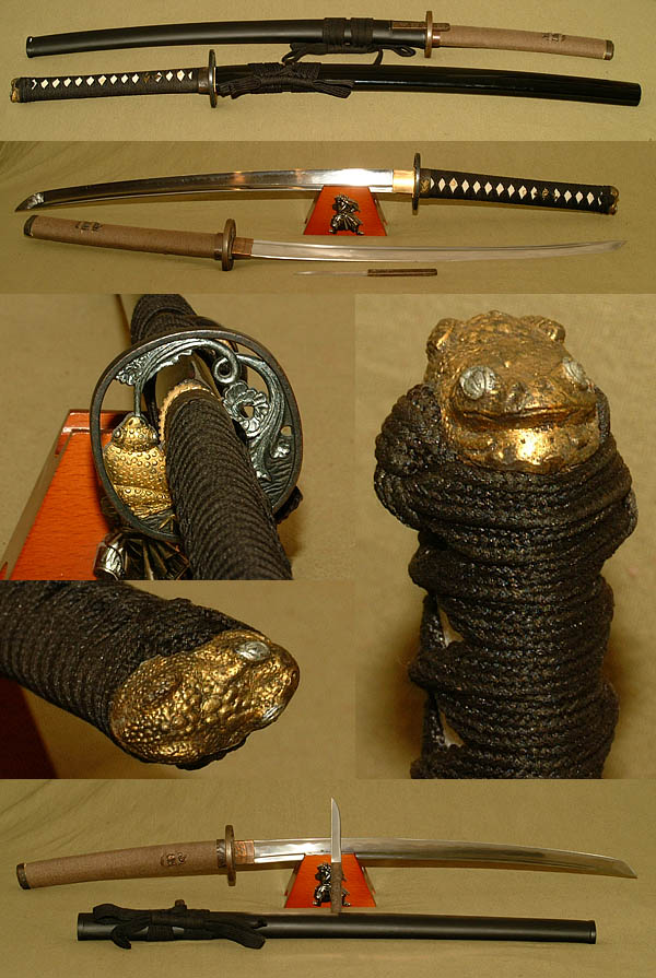 Custom ordered these last year from an eBay sword shop out of Hong Kong that is either defunct or changed their name. (There’s a few other sellers with the same goods now.) Nice thing was they let me get katana handles on wakizashi blades, and had a variety of wrappings and fixtures. I love the brown twine handle, and while I dislike ornate gold stuff, they had a set-up that was toad themed, 50s ninja wizard style!