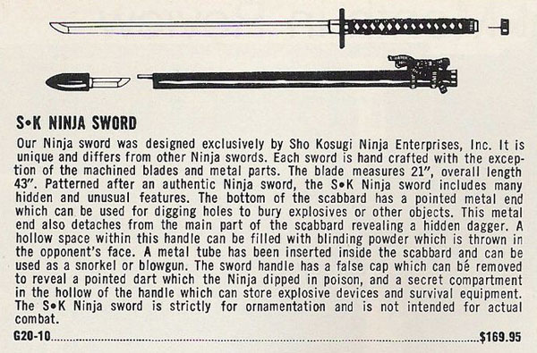This is the OFFICIAL “S-K Ninja Sword” sold by Sho Kosugi Ninja Enterprises, Inc. There’s a real chicken-and-egg relationship between his fealty to this style blade on screen and the sale of a merchandised version off.